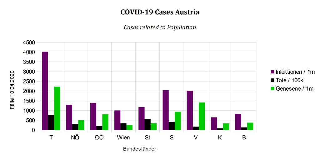 Wie inzwischen alle wissen, liegt Tirol in absoluten Infektionszahlen an der Spitze. Das Burgenland, im Osten des Landes an der ungarischen Grenze gelegen, hat die wenigsten Infektionen.