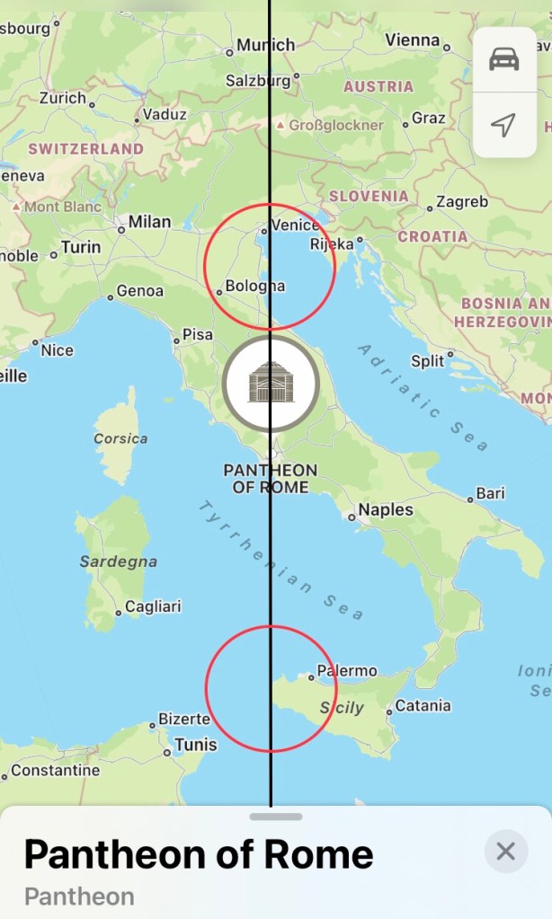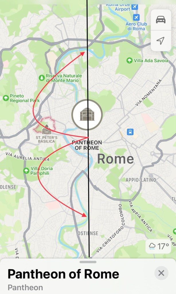 My own research has shown that the Earth‘s Zero Meridian, the „Planetary Midline“, the Equator between East and West runs exactly through the Pantheon in Rome (Longitude 12,4769° East)