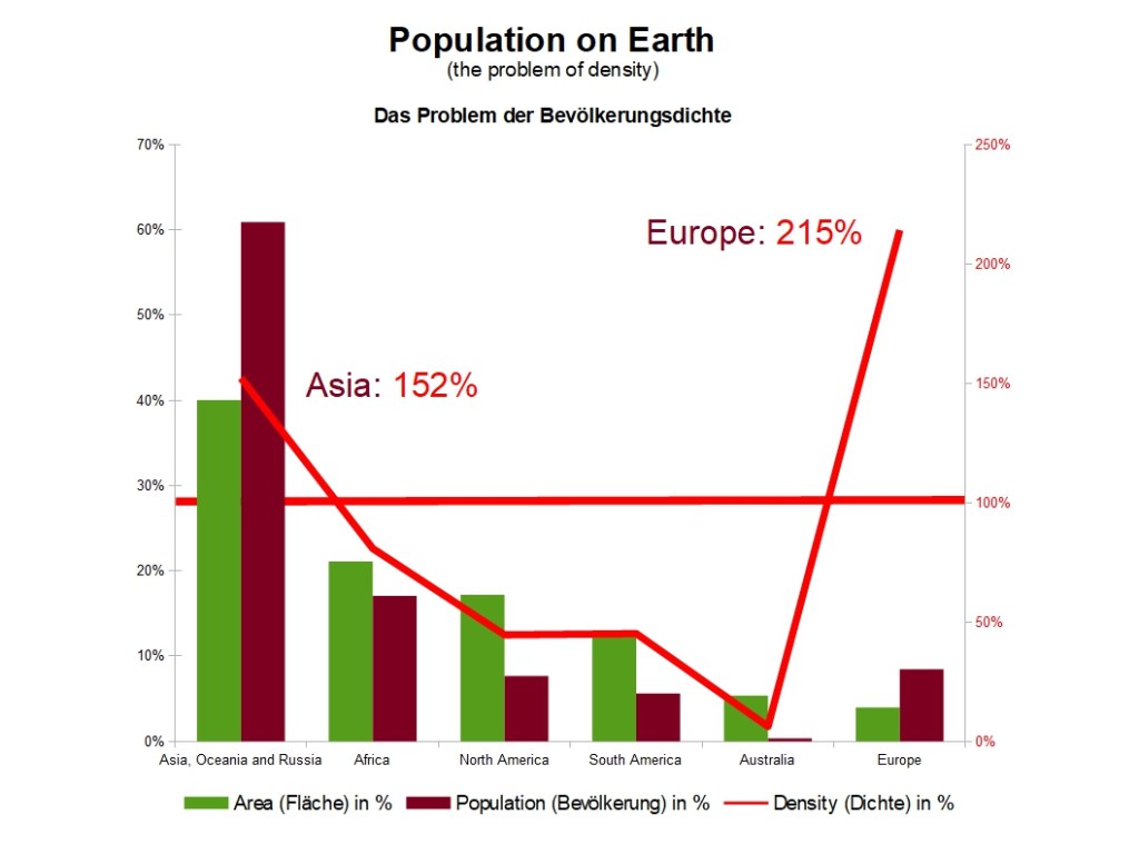 Heute sind wir etwa 7,7 Milliarden Menschen auf diesem Planeten. Die meisten von uns leben in Asien, die wenigsten in Australien und Ozeanien. Die weitaus meisten Menschen pro Fläche (Dichte) leben in Europa: