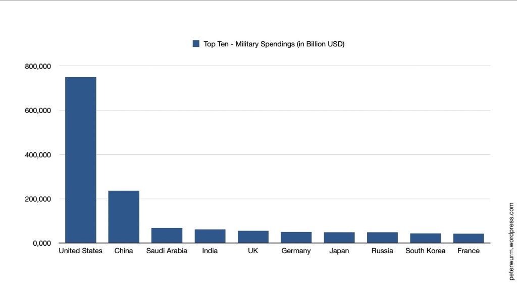 Die Vereinigten Staaten von Amerika geben weltweit das meiste Geld für Waffen aus, und das mit großem Abstand. Die Militärausgaben der USA entsprechen derzeit fast 40 Prozent der gesamten Erde, mehr als die der zehn nächsten Länder zusammen.