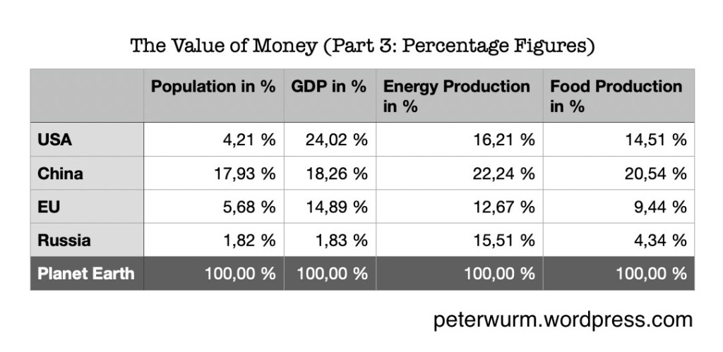 For example, we see that the US, with 4.21% of the world’s population, earns 24.02% of the money and produces 16.21% of the world’s energy, as well as 14.51% of all the world’s food. Russia, on the other hand, with 1.82% of the world’s population, earns only 1.83% of the money worldwide, while producing 15.51% of the world’s energy and 4.34% of all its food.