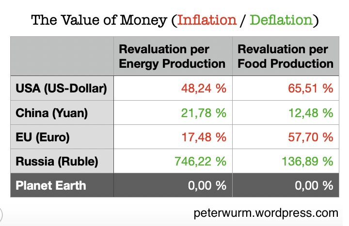 We see that only part of the US and EU money is backed by energy production and food production. China produces slightly more energy and food than it earns in money. Russia produces 8.46 times as much energy and 2.36 times as much food as it earns.